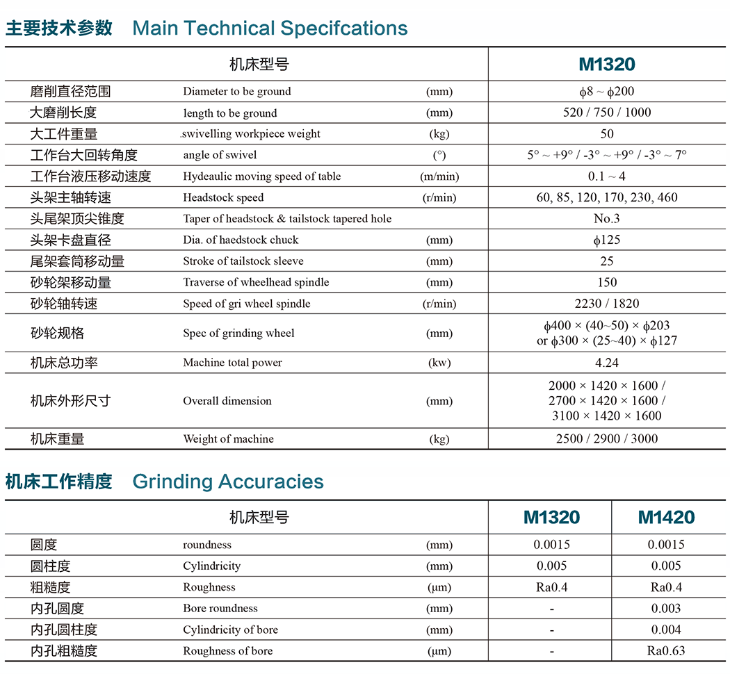 ![]() 机床的主要特点MainCharacteristics •M1320×500外圆磨床机床机构灵巧、精度稳定、磨削效率高。工件、砂轮。油泵和冷却泵分别以单独电机带动。 •配置了液压驱动和电气控制操作方便。具有精巧简廉特点,适宜于成批及大量生产车间,磨削圆柱形或圆锥形外圆工件。 •本机床是在M1320的基础上对其主要液压部件有压筒,快速进退油缸、操纵箱、压力阀板、油泵等作了重新设计。 •工作台面回转角度从顺时针3°,逆时针6°加大为顺时针5°,逆时针9°。机床的外形方面也做了较大的改进。 •Withflexiblestructure,stableaccuracy&highgrindindeffciency.Workpiece,wheel,oil-pump,andcoolantpumparerespectivelydrivenbytheirindividualmotors. •Ithashydraulicdrive,electriccontrolforconvenientoperation.Itissuitableforbatchandmassproductionforgrindingcylindricalorconicalworkpieces. •ItisdesignedonthebaseofM1320,especiallyinmrovedforitshydrauliccylindeers,rapidadvance&withdrawalcylindercontrolbox,presure-valveboardandoilpump. •TheswingangleofworktableisincreasedfromC.W.3°andC.C.W.6°toC.W.5°andC.C.W.9°.Theoverallappearanceofthemachineisalsoimproved.